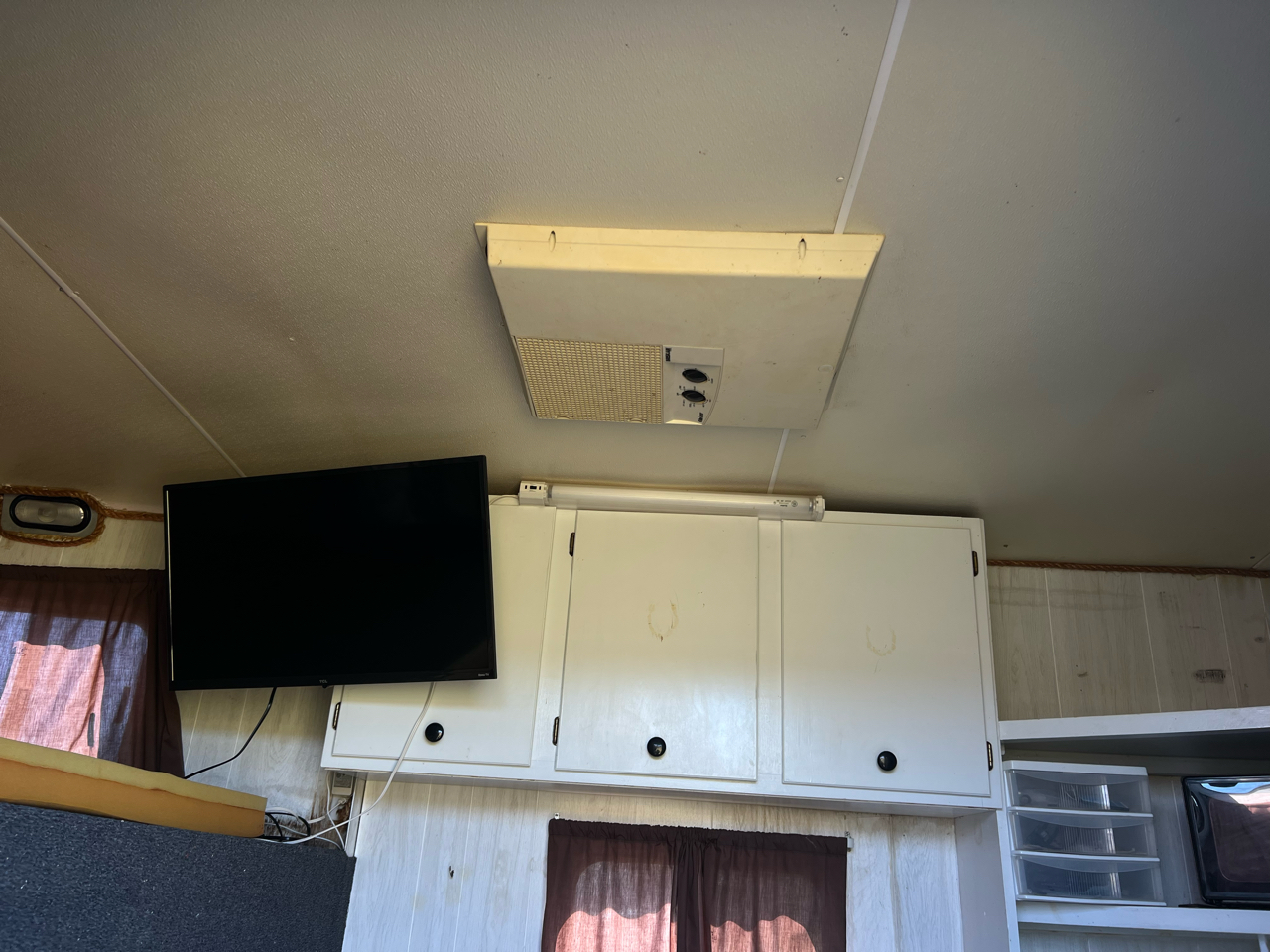Living Quarters • Professionally finished cowboy shower, microwave, television, and refrigerator—all in full working order. • Climate-controlled comfort with ample cabinetry and clean, well-kept interiors. • Ideal for overnight events or extended travel.